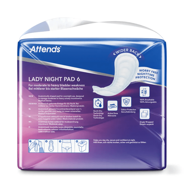 Lady Night Pads sind weiche sehr saugfähige Einlagen speziell für die Nacht. Sie sind hinten breiter und sorgen für zusätzlichen Schutz im Liegen. Für mittlere und starke Harninkontinenz geeignet.