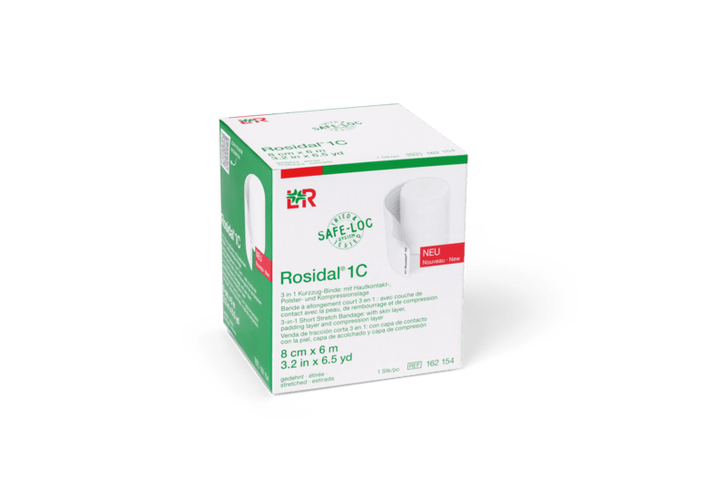 Die 3-in-1 Kurzzugbinde kombiniert Hautkontakt-, Polsterschicht- und Kompressionslage in einer einzigen Kurzzugbinde. Rosidal 1C ist zeitsparend, effektiv und einfach in der Anwendung.